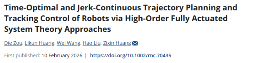 论文信息:Die Zou, Likun Huang, Wei Wang, Hao Liu, Zixin Huang*. Time-Optimal and Jerk-Continuous Trajectory Planning and Tracking Control of Robots via High-Order Fully Actuated System Theory Approaches, International Journal of Robust and Nonlinear Control, 2026, DOI: 10.1002/rnc.70435