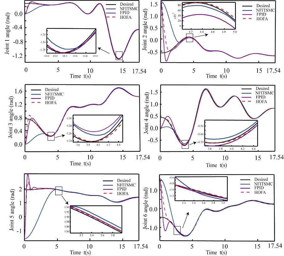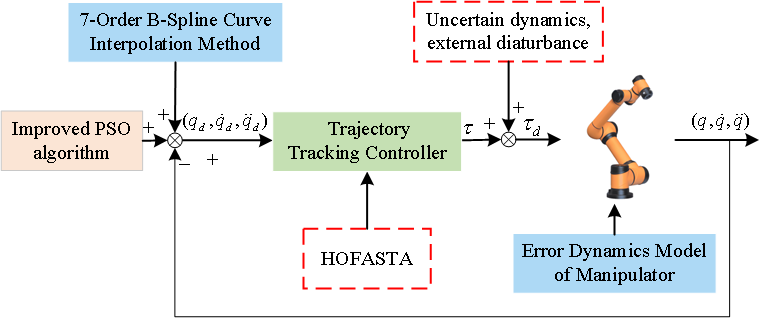 多自由度机械臂作为机器人工程、智能制造、自动化与智能控制领域的核心研究对象,是实现高精度作业、柔性协作及复杂环境自主操作的关键装备,具有重要的理论研究价值与工程应用意义。本文提出了一种创新的轨迹规划算法和跟踪控制策略,该策略能够确保机器人的连续运动,并最大限度地减少时间消耗,同时实现精确的轨迹跟踪。首先,建立了系统的运动学模型和动力学模型,并使用等价变换将动力学模型转换为一个高阶全驱动系统模型。随后,采用7阶B样条曲线插值法在关节空间内构建脉动连续的插值轨迹;以最短轨迹运动时间为优化目标,将轨迹曲线与改进的粒子群优化算法相结合进行优化,优化后的轨迹相比传统粒子群算法,运动时间缩短了27.2%。在轨迹跟踪控制方面,通过高阶全驱系统理论方法,设计了一款实用的控制器。对比实验表明,本文所采用的高阶全驱系统方法(HOFASTA),在轨迹跟踪精度与突加负载扰动下的鲁棒性方面,均优于传统的非奇异快速终端滑模控制(NFITSMC)和模糊PID(FPID)控制器如图2。