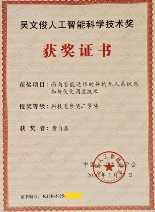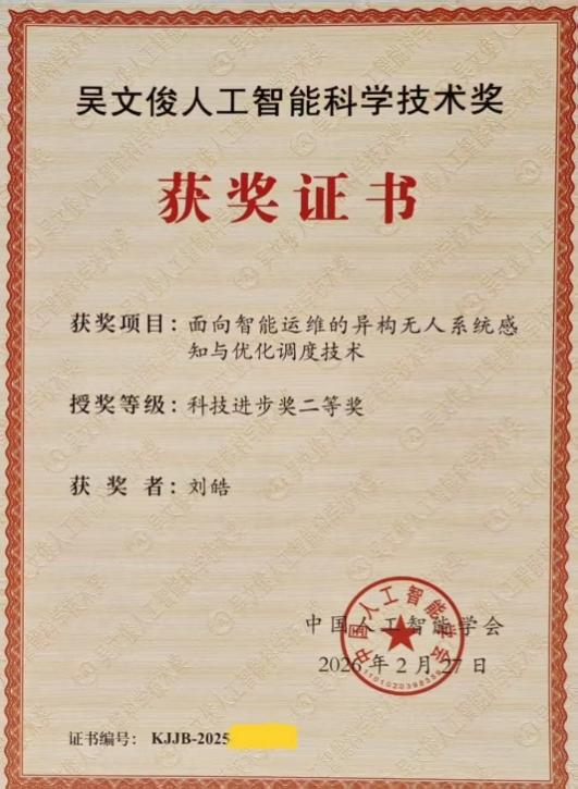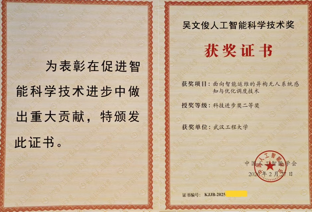 本网讯(通讯员 刘皓 朱丽娜)2026年3月29日,2025吴文俊人工智能创新大会暨第十五届吴文俊人工智能科学技术奖颁奖典礼在江苏常州召开。由武汉工程大学黄自鑫教授联合北京理工大学、国网山西省电力有限公司孝义市供电分公司、浙江浙能数字科技有限公司、浙江和朴实业有限公司、国网山西省电力有限公司吕梁供电分公司等单位共同完成的成果“面向智能运维的异构无人系统感知与优化调度技术”获吴文俊人工智能科学技术奖科技进步二等奖。我校主要完成人:黄自鑫、刘皓。