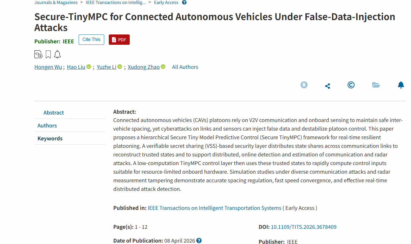 本网讯(通讯员 吴洪恩 朱丽娜)近日,电气信息学院2024级硕士研究生吴洪恩(导师:刘皓)以第一作者,刘皓老师为通信作者,在网联车安全控制领域国际Top期刊《IEEE Transactions on Intelligent Transportation Systems》发表题为《Secure TinyMPC for connected autonomous vehicles under false-data-injection attacks》的学术论文(DOI: 10.1109/TITS.2026.3678409)。