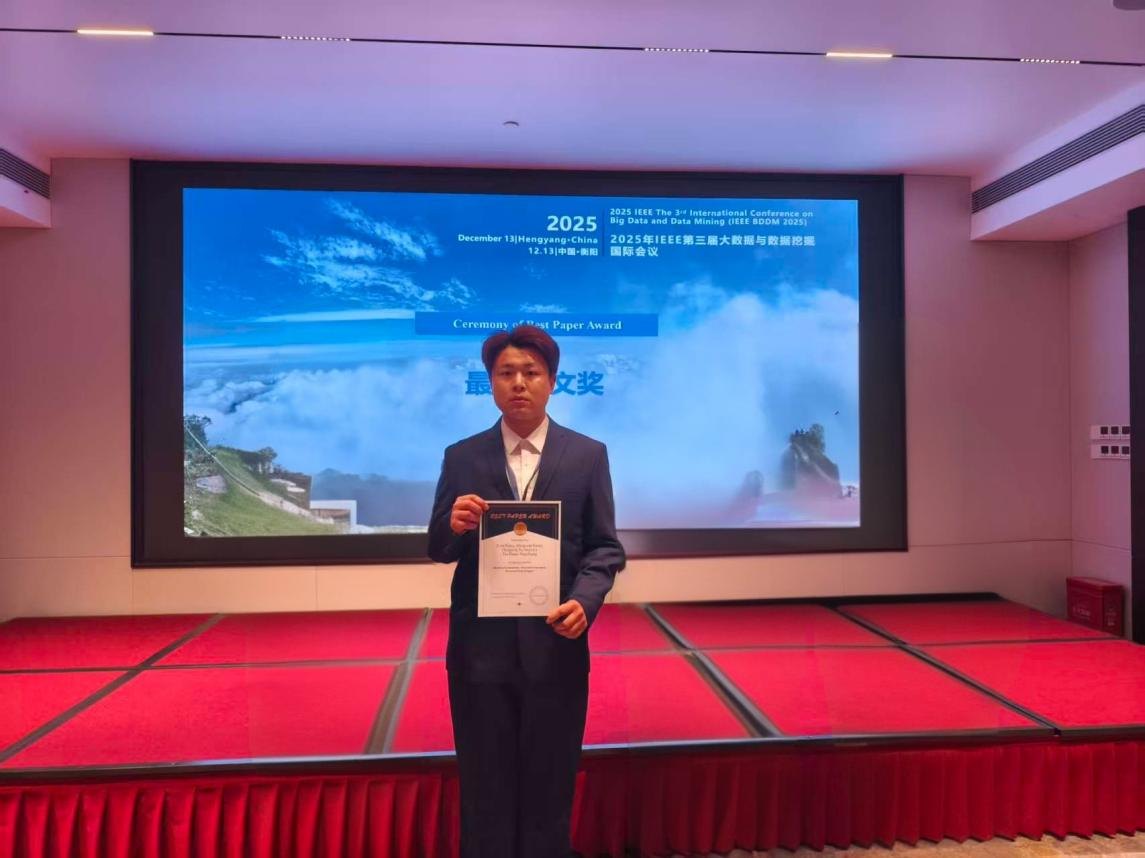 本网讯(通讯员 卢俊杰 黄晟原)近日,电气信息学院2025级硕士研究生黄晟原(导师:黄自鑫)在IEEE BDDM 2025(2025 IEEE the 3rd International Conference on Big Data and Data Mining)上,发表题为“Chemical Laboratory-Oriented Corrosion-Resistant Soft Gripper”论文,并获最佳论文奖,论文署名第一及通讯单位均为武汉工程大学。会议主要围绕大数据分析与数据挖掘领域的前沿关键技术展开,旨在为来自高校、科研院所和企业的一线研究人员、工程师、专家学者以及行业专业人士搭建一个高水平的国际交流平台,集中展示大数据与数据挖掘领域的最新研究成果和工程实践经验,推动理论研究与实际应用的深度融合,促进交叉创新与产学研合作,为数据驱动智能时代的发展贡献力量。