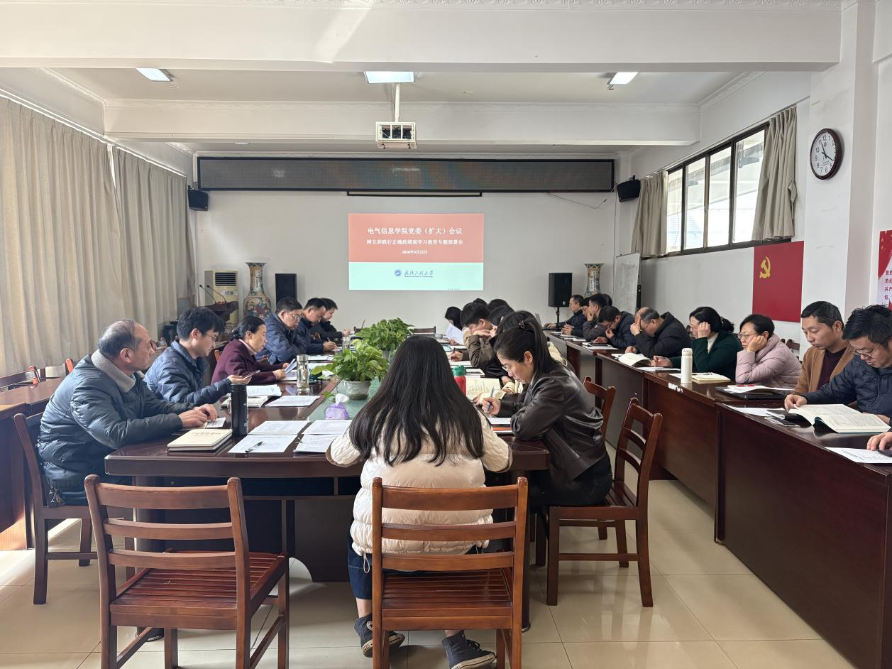 谢春晖在总结讲话中提出三点要求:一是提高政治站位,深刻把握学习教育重大意义。要充分认识开展学习教育是落实上级部署、纵深推进全面从严治党的必然要求,是践行以师生为中心的发展思想、推动学院高质量发展的重要契机,要切实筑牢思想根基,提振干事创业精气神。二是紧扣目标要求,扎实推进学习教育各项任务落地。要严格按照“立党为公、为民造福、科学决策、真抓实干”总要求,依托党委理论学习中心组、党支部“三会一课”等载体推动学习教育入脑入心;聚焦学科建设、人才培养、师生急难愁盼等重点找准问题症结;坚持边查边改,健全长效机制;广泛听取师生意见,凝聚工作合力。三是坚持以学促干,推动学习教育成果转化。要将正确政绩观贯穿工作全过程,真抓实干推进年度重点任务,统筹兼顾党建与业务工作,提升治理效能。学院将成立学习教育专班,压实责任,力戒形式主义,引导党员干部立足电气学科特色,服务湖北支点建设,以实干实绩推动学院一流学科建设再上新台阶,为学校高质量发展贡献电气力量。