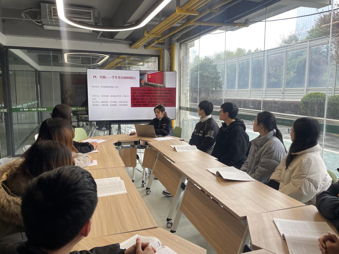 郭方圆以《树立和践行正确政绩观》为题进行学习分享,学生党员应践行党员先锋模范作用,在学习科研、志愿服务、社会实践中展担当、真作为、做表率。同时深刻理解个人发展与时代需求同频共振,提升专业素养、锤炼过硬本领,不断夯实个人成长根基,以实干担当书写属于新时代的青春答卷。