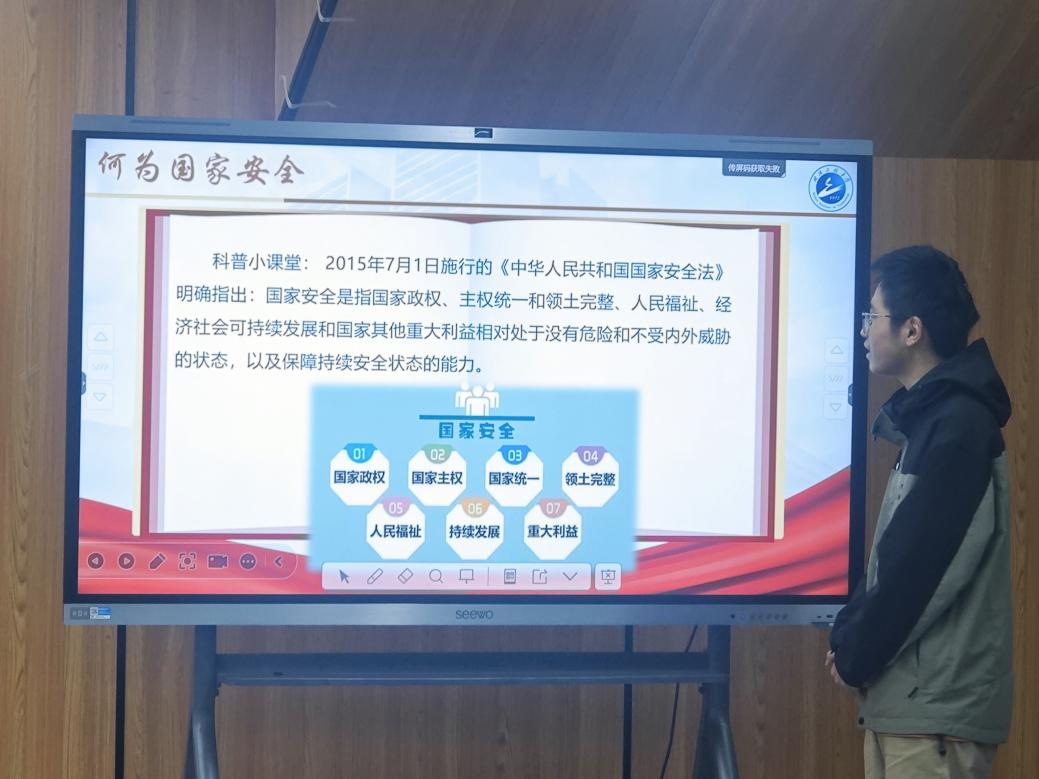 钟道瑞以《国家安全,青春挺膺》为题进行了国家安全教育学习分享。他阐述了总体国家安全观的核心内涵,围绕政治安全、经济安全、网络安全、生物安全等16个重点领域展开讲解,并结合宿舍电器火灾、实验室安全事故、电信网络诈骗等校园真实案例进行了深刻的警示剖析。他强调,学生党员应在严守政治底线、防范安全隐患、提高防诈意识三个方面带头践行,从文明上网、抵制邪教渗透、杜绝违章电器等身边小事做起,共筑平安校园防线,以青春之力护航国家安全。