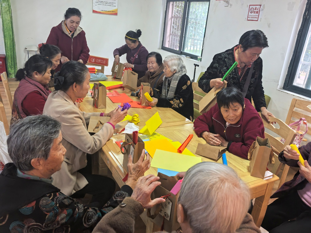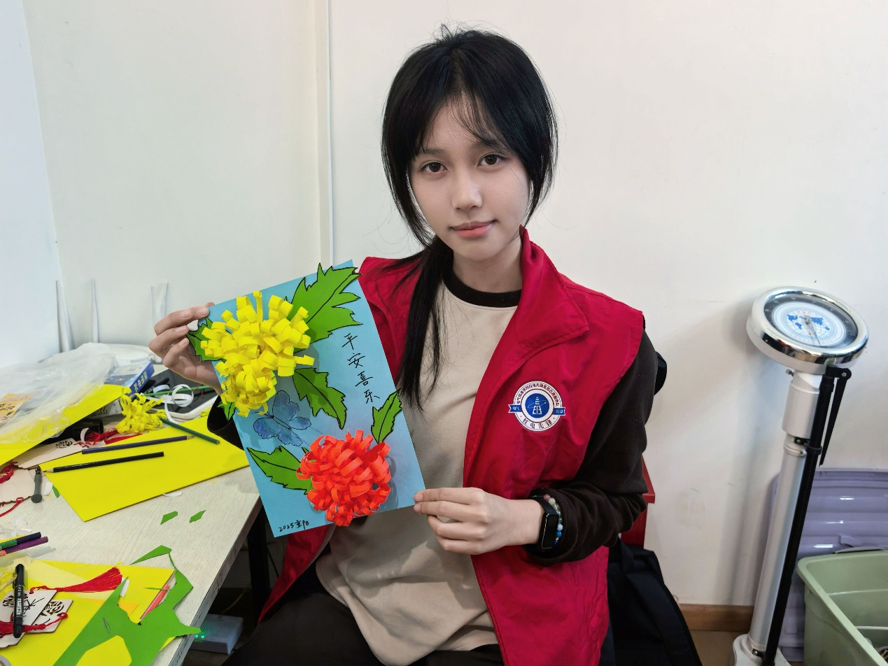 在维修电器的同时,社区活动室内的菊花卡纸拼贴画创作活动也在志愿者的组织下有序开展。志愿者提前准备了彩纸、剪刀、双面胶等材料,耐心指导老人创作。他们从折纸技巧讲起,示范如何剪出菊花的层次花瓣,再教老人用绿色卡纸制作叶片,最后将各部分拼贴成一幅完整的菊花图。活动中,志愿者还为参与活动的老人送上精心准备的礼包,礼包内有菊花茶,还有志愿者手写祝福语的挂坠。老人们手捧礼包和自己创作的菊花拼贴画,脸上洋溢着幸福的笑容。
